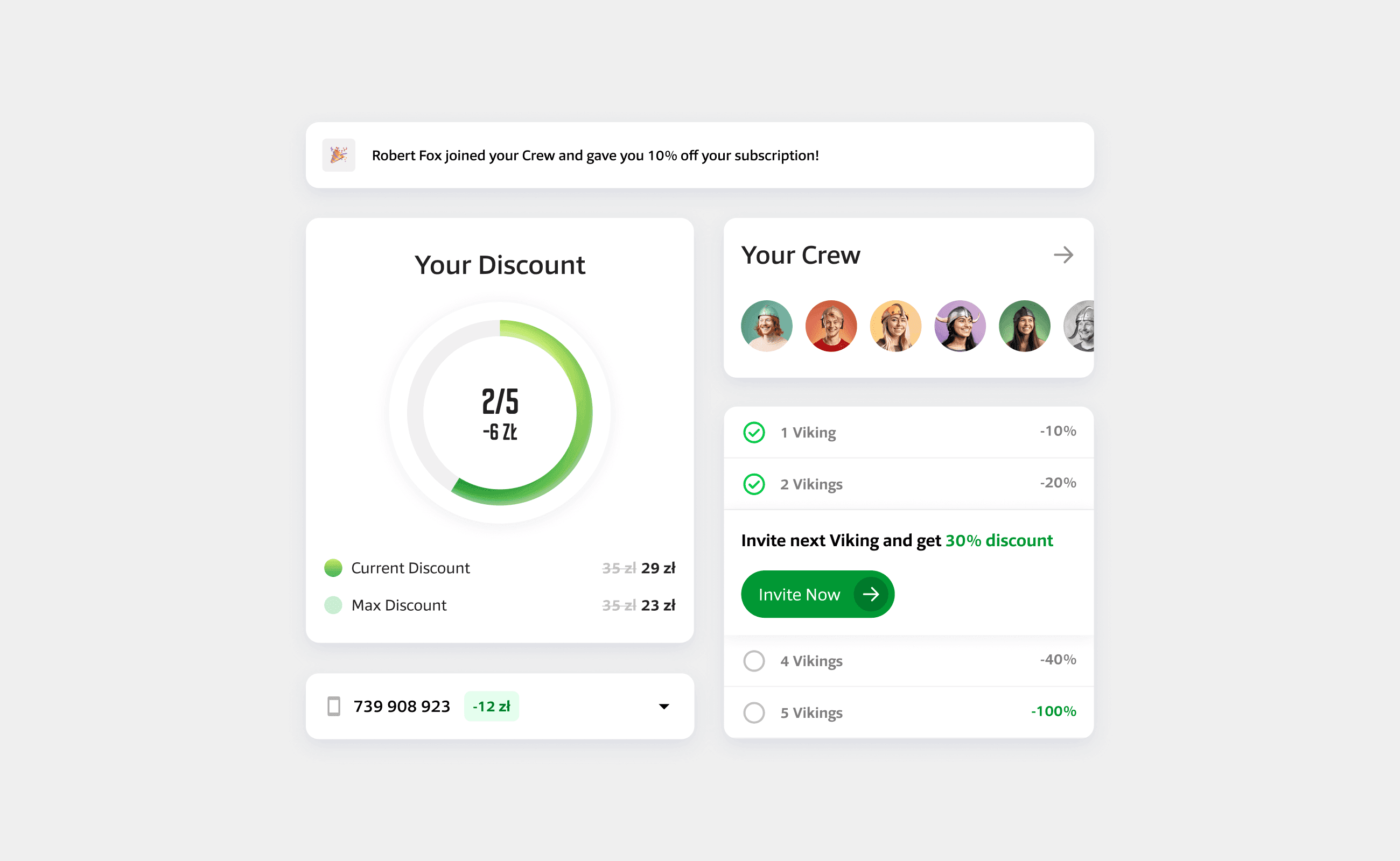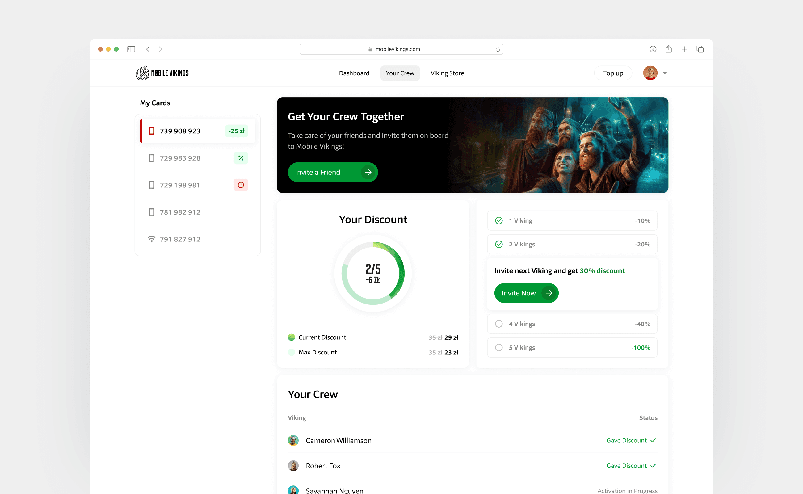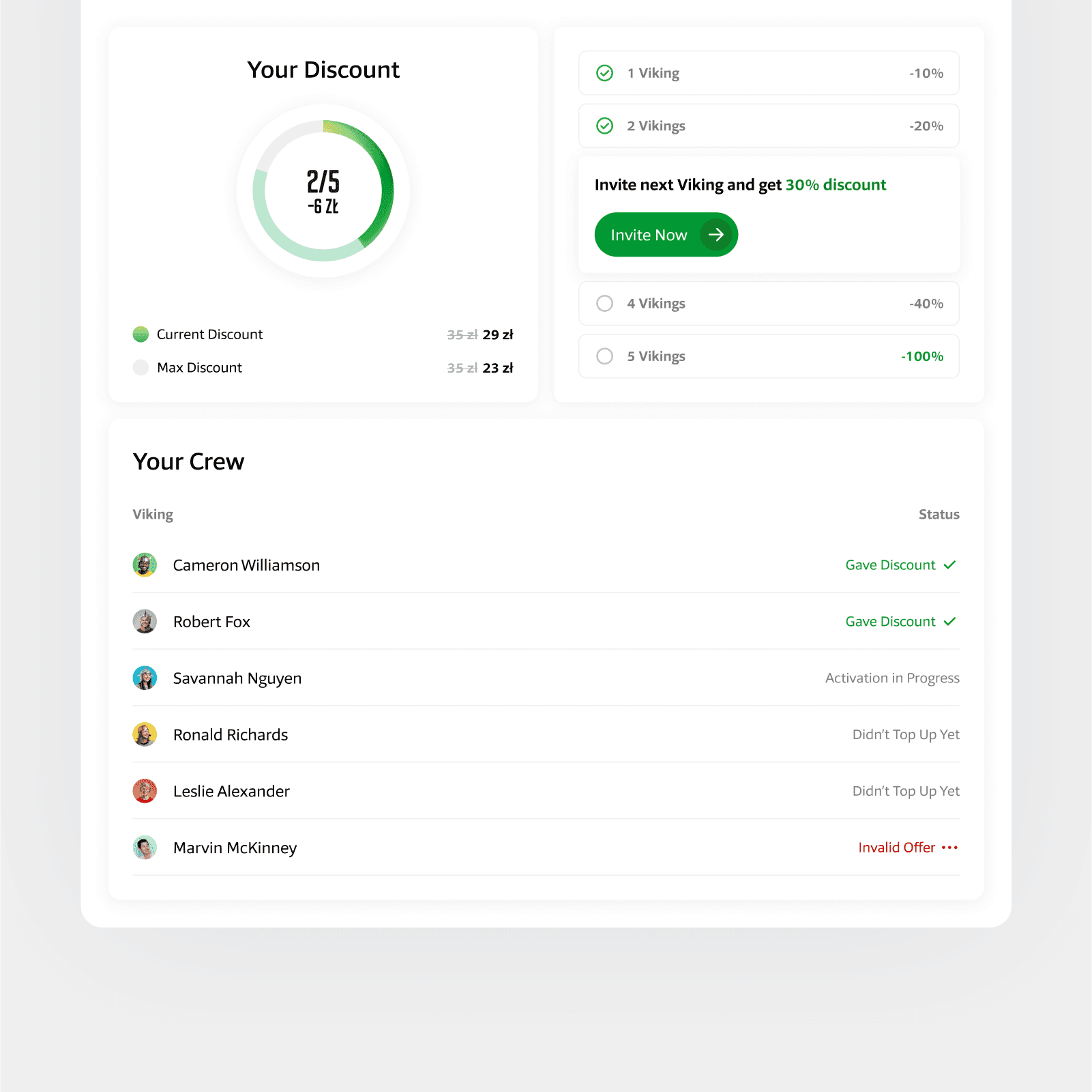 The main challenge of the project was to design a new dashboard summarizing all info about the user's discount status, people their invite to the app, their crew status, and much more.
