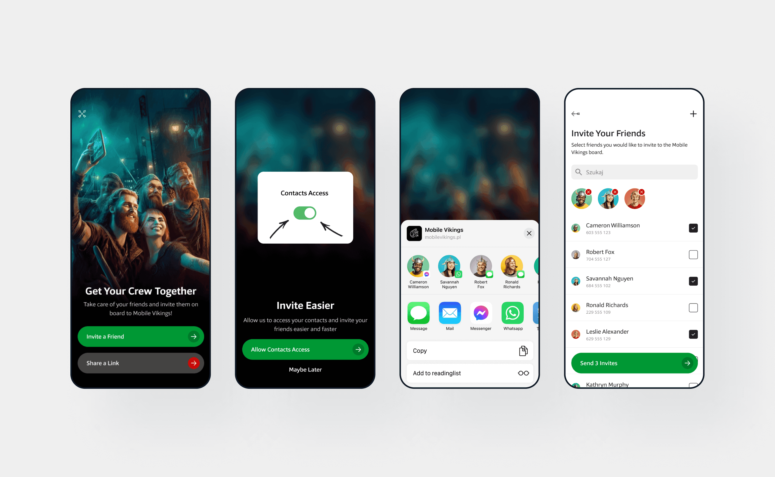 A lot of Mobile Vikings clients get recommended by their friends, which happens in various settings like parties, dinners, or chats in the office. It was critical to have a user invite flow that is seamless and easy to do, regardless of the situation and the amount of time and effort someone is willing to spend on it.