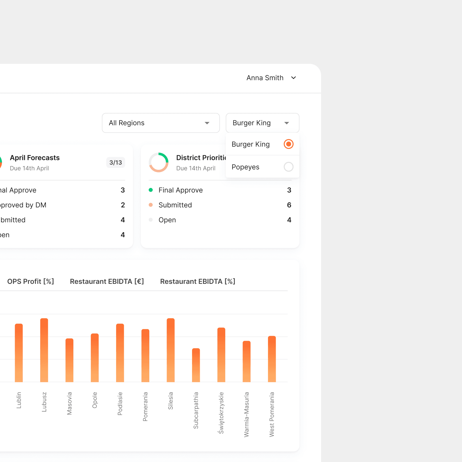 The project included different data forms, analytics dashboards, acceptance workflows, and manager-supervisor communication. The system is now used daily by managers making Burger King and Pepeyes operations in Europe run smoothly.