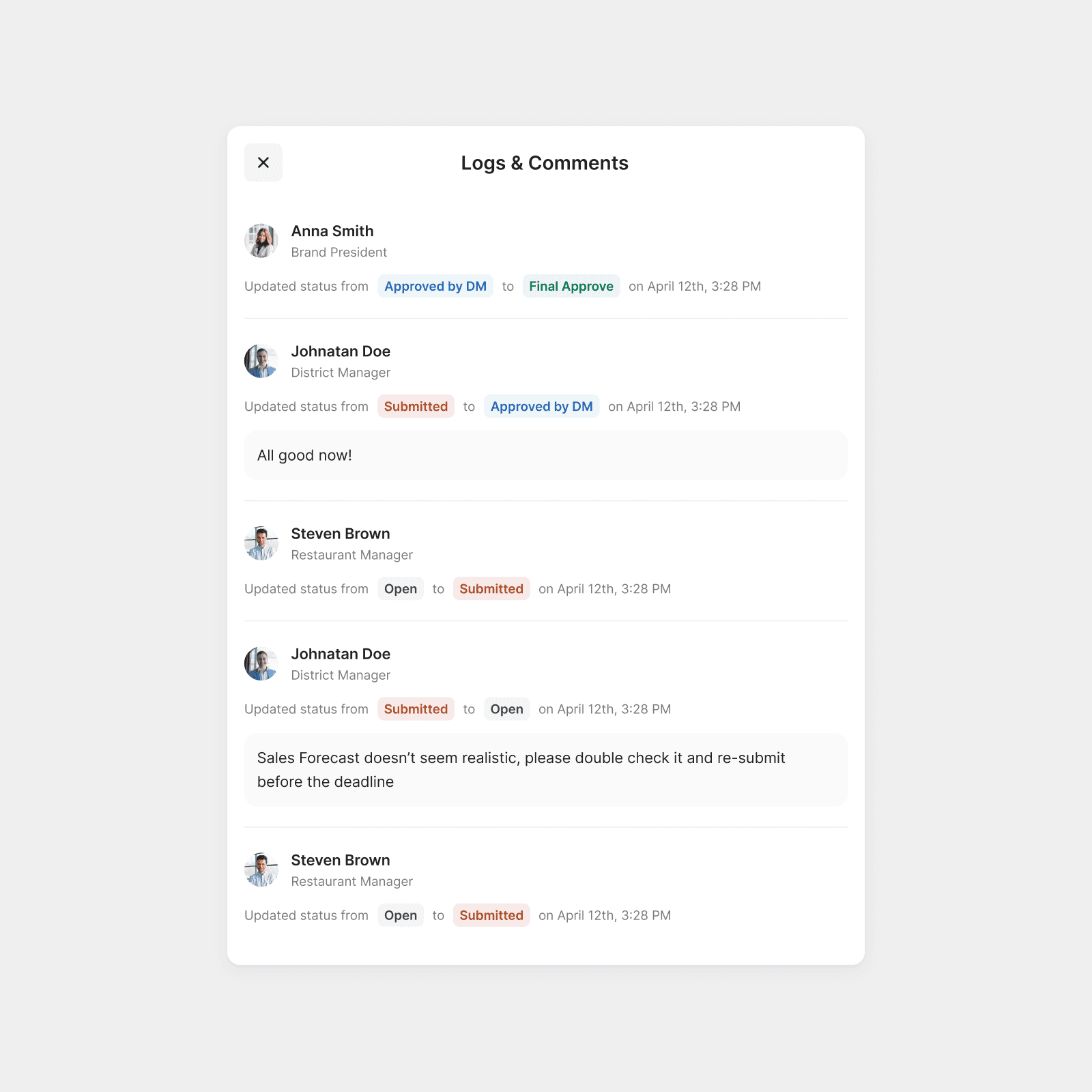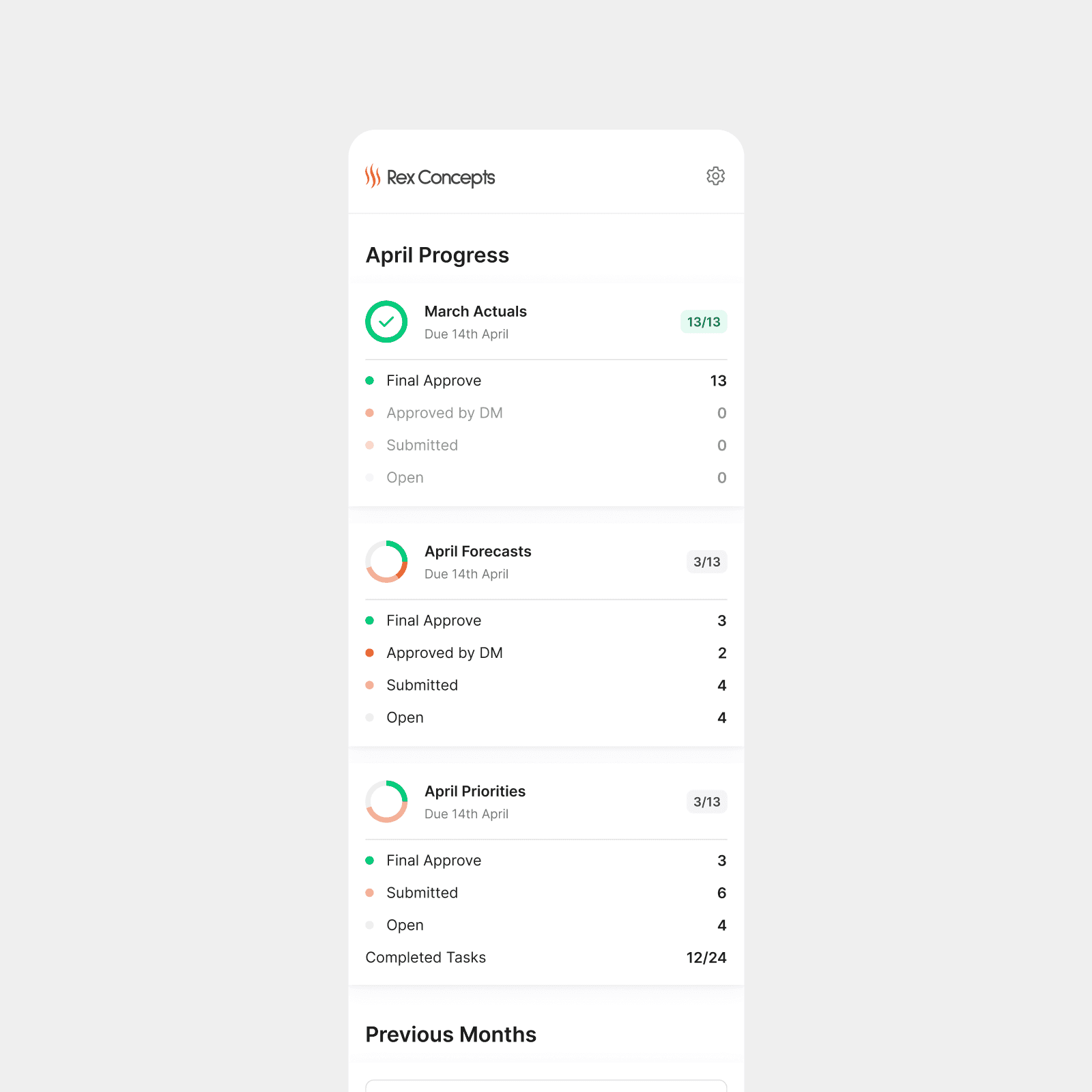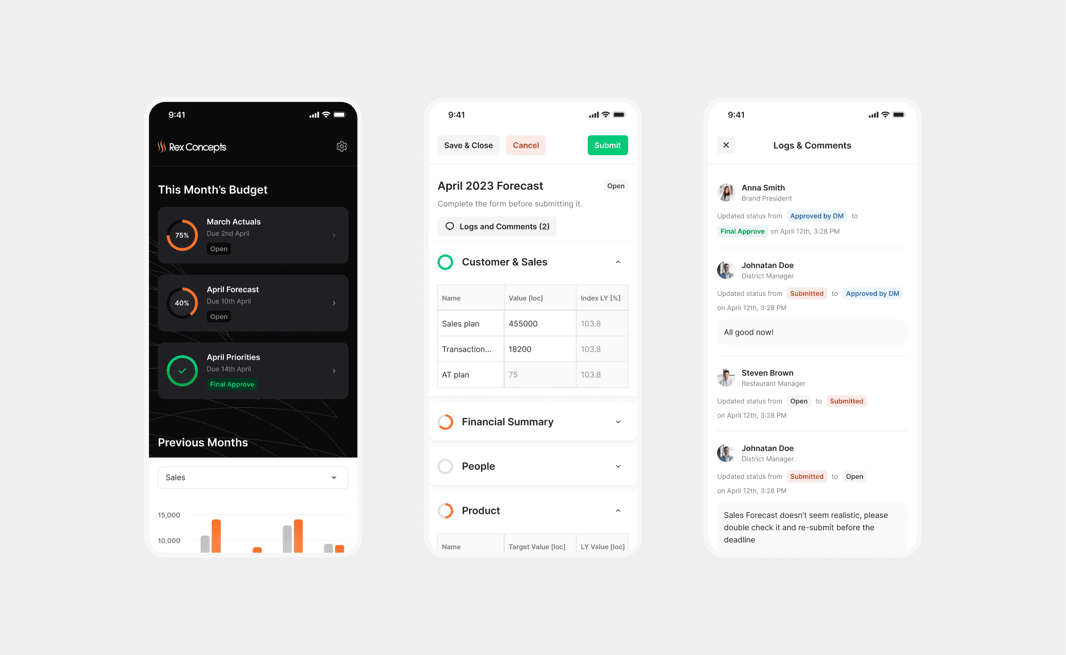 The app allows different managers to overlook and approve work done by employees they manage and make sure everything on their side is reported to their supervisors. Seamless workflows were enabled by clear status logs and pipelines, communication tools and multi-channel notifications.